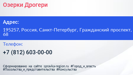 Озерки Дрогери по адресу 195257, Россия, Санкт-Петербург, Гражданский проспект, 68 в дальнейшем Организация, размещена в следующих категориях: