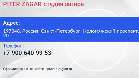 PITER ZAGAR, студия загара по адресу 197348, Россия, Санкт-Петербург, Коломяжский проспект, 20 в дальнейшем Организация, размещена в следующих категориях: