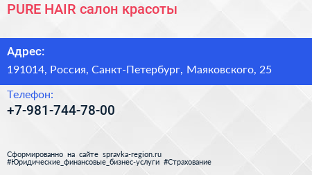 PURE HAIR, салон красоты по адресу 191014, Россия, Санкт-Петербург, Маяковского, 25 в дальнейшем Организация, размещена в следующих категориях: