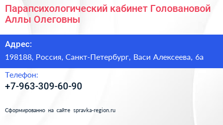 Парапсихологический кабинет Головановой Аллы Олеговны по адресу 198188, Россия, Санкт-Петербург, Васи Алексеева, 6а в дальнейшем Организация, размещена в следующих категориях: