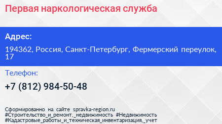 Первая наркологическая служба по адресу 194362, Россия, Санкт-Петербург, Фермерский переулок, 17 в дальнейшем Организация, размещена в следующих категориях: