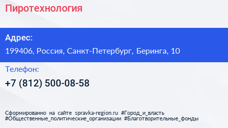 Пиротехнология по адресу 199406, Россия, Санкт-Петербург, Беринга, 10 в дальнейшем Организация, размещена в следующих категориях: