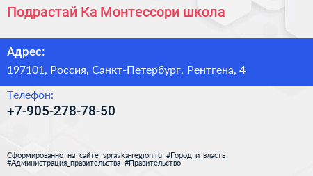 Подрастай-Ка, Монтессори-школа по адресу 197101, Россия, Санкт-Петербург, Рентгена, 4 в дальнейшем Организация, размещена в следующих категориях: