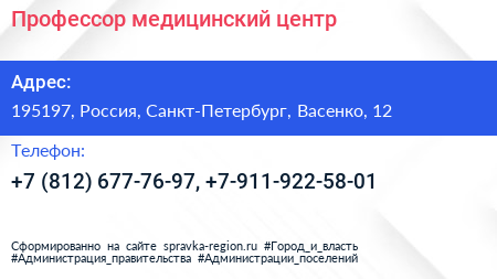 Профессор, медицинский центр по адресу 195197, Россия, Санкт-Петербург, Васенко, 12 в дальнейшем Организация, размещена в следующих категориях: