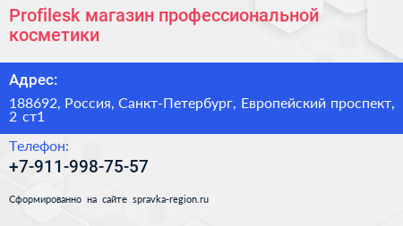 Profilesk, магазин профессиональной косметики по адресу 188692, Россия, Санкт-Петербург, Европейский проспект, 2 ст1 в дальнейшем Организация, размещена в следующих категориях: