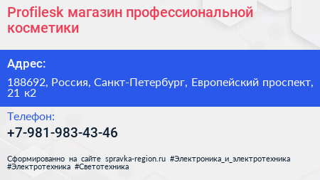 Profilesk, магазин профессиональной косметики по адресу 188692, Россия, Санкт-Петербург, Европейский проспект, 21 к2 в дальнейшем Организация, размещена в следующих категориях: