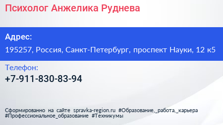 Психолог Анжелика Руднева по адресу 195257, Россия, Санкт-Петербург, проспект Науки, 12 к5 в дальнейшем Организация, размещена в следующих категориях: