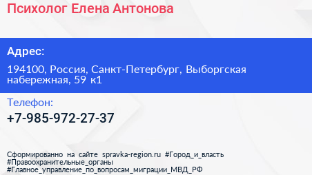 Психолог Елена Антонова по адресу 194100, Россия, Санкт-Петербург, Выборгская набережная, 59 к1 в дальнейшем Организация, размещена в следующих категориях: