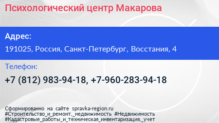 Психологический центр Макарова по адресу 191025, Россия, Санкт-Петербург, Восстания, 4 в дальнейшем Организация, размещена в следующих категориях: