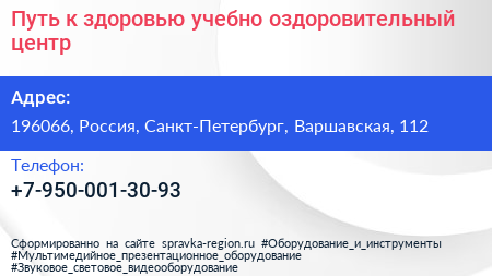Путь к здоровью, учебно-оздоровительный центр по адресу 196066, Россия, Санкт-Петербург, Варшавская, 112 в дальнейшем Организация, размещена в следующих категориях: