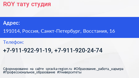 ROY, тату-студия по адресу 191014, Россия, Санкт-Петербург, Восстания, 16 в дальнейшем Организация, размещена в следующих категориях: