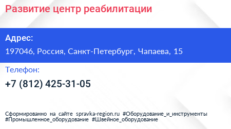 Развитие, центр реабилитации по адресу 197046, Россия, Санкт-Петербург, Чапаева, 15 в дальнейшем Организация, размещена в следующих категориях: