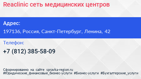 Reaclinic, сеть медицинских центров по адресу 197136, Россия, Санкт-Петербург, Ленина, 42 в дальнейшем Организация, размещена в следующих категориях: