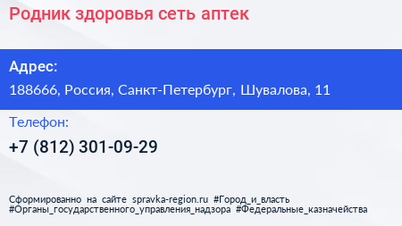 Родник здоровья, сеть аптек по адресу 188666, Россия, Санкт-Петербург, Шувалова, 11 в дальнейшем Организация, размещена в следующих категориях: