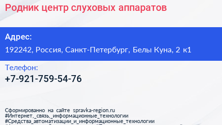 Родник, центр слуховых аппаратов по адресу 192242, Россия, Санкт-Петербург, Белы Куна, 2 к1 в дальнейшем Организация, размещена в следующих категориях: