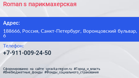 Roman`s, парикмахерская по адресу 188666, Россия, Санкт-Петербург, Воронцовский бульвар, 6 в дальнейшем Организация, размещена в следующих категориях: