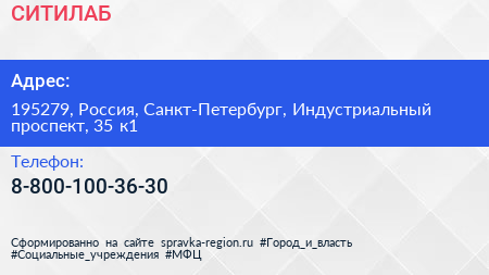 СИТИЛАБ по адресу 195279, Россия, Санкт-Петербург, Индустриальный проспект, 35 к1 в дальнейшем Организация, размещена в следующих категориях: