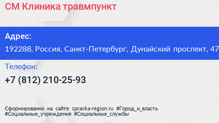 СМ-Клиника, травмпункт по адресу 192288, Россия, Санкт-Петербург, Дунайский проспект, 47 в дальнейшем Организация, размещена в следующих категориях: