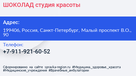 ШОКОЛАД, студия красоты по адресу 199406, Россия, Санкт-Петербург, Малый проспект В.О., 90 в дальнейшем Организация, размещена в следующих категориях: