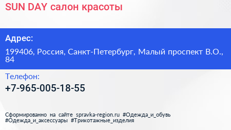 SUN DAY, салон красоты по адресу 199406, Россия, Санкт-Петербург, Малый проспект В.О., 84 в дальнейшем Организация, размещена в следующих категориях: