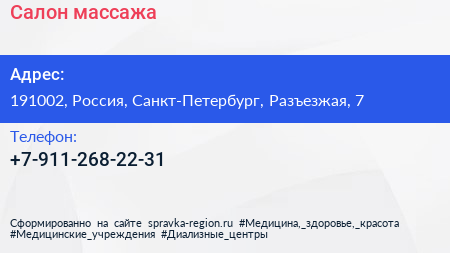 Салон массажа по адресу 191002, Россия, Санкт-Петербург, Разъезжая, 7 в дальнейшем Организация, размещена в следующих категориях: