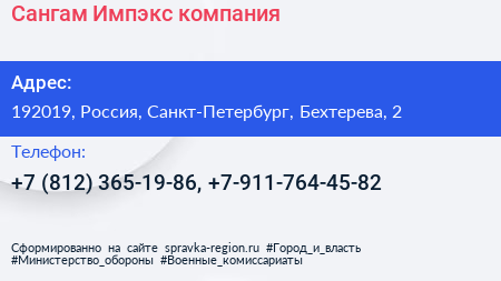 Сангам Импэкс, компания по адресу 192019, Россия, Санкт-Петербург, Бехтерева, 2 в дальнейшем Организация, размещена в следующих категориях: