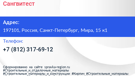 Сангвитест по адресу 197101, Россия, Санкт-Петербург, Мира, 15 к1 в дальнейшем Организация, размещена в следующих категориях:
