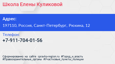 Школа Елены Куликовой по адресу 197110, Россия, Санкт-Петербург, Рюхина, 12 в дальнейшем Организация, размещена в следующих категориях: