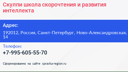 Скулпи, школа скорочтения и развития интеллекта по адресу 192012, Россия, Санкт-Петербург, Ново-Александровская, 14 в дальнейшем Организация, размещена в следующих категориях: