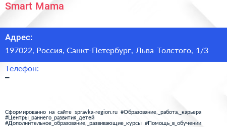 Smart Mama по адресу 197022, Россия, Санкт-Петербург, Льва Толстого, 1/3 в дальнейшем Организация, размещена в следующих категориях: