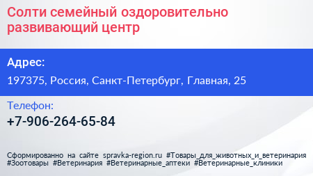 Солти, семейный оздоровительно-развивающий центр по адресу 197375, Россия, Санкт-Петербург, Главная, 25 в дальнейшем Организация, размещена в следующих категориях: