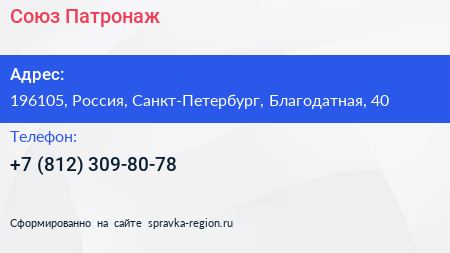 Союз Патронаж по адресу 196105, Россия, Санкт-Петербург, Благодатная, 40 в дальнейшем Организация, размещена в следующих категориях: