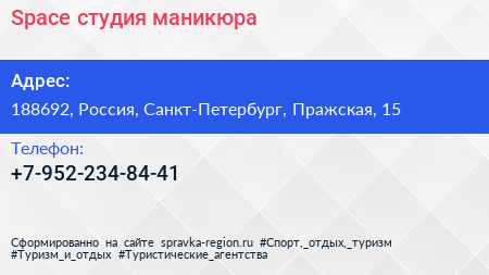 Space, студия маникюра по адресу 188692, Россия, Санкт-Петербург, Пражская, 15 в дальнейшем Организация, размещена в следующих категориях: