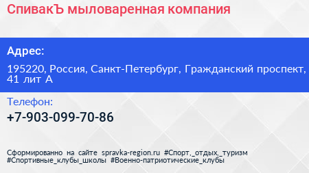 СпивакЪ, мыловаренная компания по адресу 195220, Россия, Санкт-Петербург, Гражданский проспект, 41 лит А в дальнейшем Организация, размещена в следующих категориях: