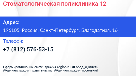 Стоматологическая поликлиника №12 по адресу 196105, Россия, Санкт-Петербург, Благодатная, 16 в дальнейшем Организация, размещена в следующих категориях: