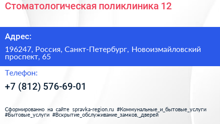 Стоматологическая поликлиника №12 по адресу 196247, Россия, Санкт-Петербург, Новоизмайловский проспект, 65 в дальнейшем Организация, размещена в следующих категориях: