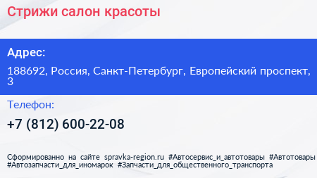 Стрижи, салон красоты по адресу 188692, Россия, Санкт-Петербург, Европейский проспект, 3 в дальнейшем Организация, размещена в следующих категориях: