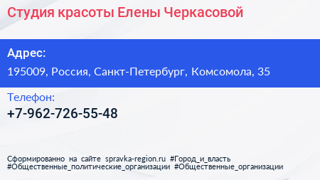 Студия красоты Елены Черкасовой по адресу 195009, Россия, Санкт-Петербург, Комсомола, 35 в дальнейшем Организация, размещена в следующих категориях: