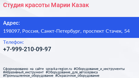 Студия красоты Марии Казак по адресу 198097, Россия, Санкт-Петербург, проспект Стачек, 54 в дальнейшем Организация, размещена в следующих категориях: