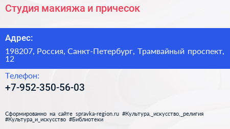 Студия макияжа и причесок по адресу 198207, Россия, Санкт-Петербург, Трамвайный проспект, 12 в дальнейшем Организация, размещена в следующих категориях:
