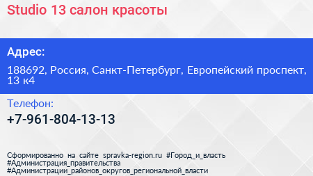 Studio 13, салон красоты по адресу 188692, Россия, Санкт-Петербург, Европейский проспект, 13 к4 в дальнейшем Организация, размещена в следующих категориях: