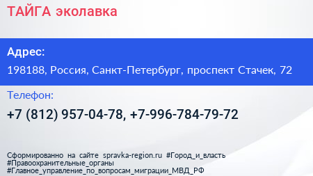 ТАЙГА, эколавка по адресу 198188, Россия, Санкт-Петербург, проспект Стачек, 72 в дальнейшем Организация, размещена в следующих категориях: