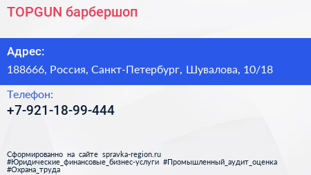 TOPGUN, барбершоп по адресу 188666, Россия, Санкт-Петербург, Шувалова, 10/18 в дальнейшем Организация, размещена в следующих категориях: