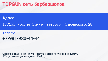 TOPGUN, сеть барбершопов по адресу 199155, Россия, Санкт-Петербург, Одоевского, 28 в дальнейшем Организация, размещена в следующих категориях: