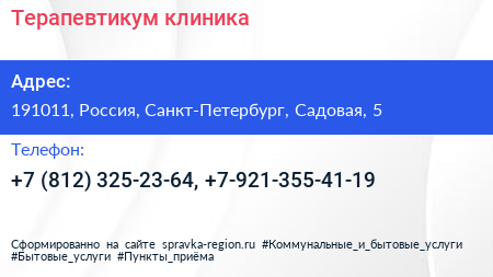 Терапевтикум, клиника по адресу 191011, Россия, Санкт-Петербург, Садовая, 5 в дальнейшем Организация, размещена в следующих категориях: