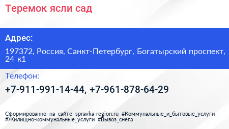 Теремок, ясли-сад по адресу 197372, Россия, Санкт-Петербург, Богатырский проспект, 24 к1 в дальнейшем Организация, размещена в следующих категориях:
