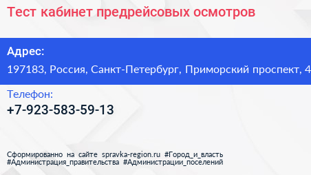 Тест, кабинет предрейсовых осмотров по адресу 197183, Россия, Санкт-Петербург, Приморский проспект, 4 в дальнейшем Организация, размещена в следующих категориях: