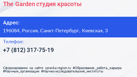 The Garden, студия красоты по адресу 196084, Россия, Санкт-Петербург, Киевская, 3 в дальнейшем Организация, размещена в следующих категориях: