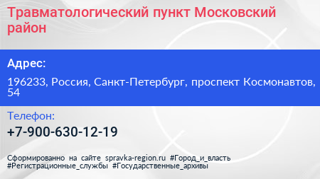 Травматологический пункт, Московский район по адресу 196233, Россия, Санкт-Петербург, проспект Космонавтов, 54 в дальнейшем Организация, размещена в следующих категориях: