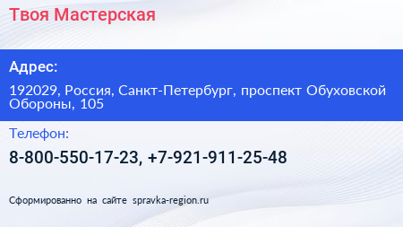 Твоя Мастерская по адресу 192029, Россия, Санкт-Петербург, проспект Обуховской Обороны, 105 в дальнейшем Организация, размещена в следующих категориях:
